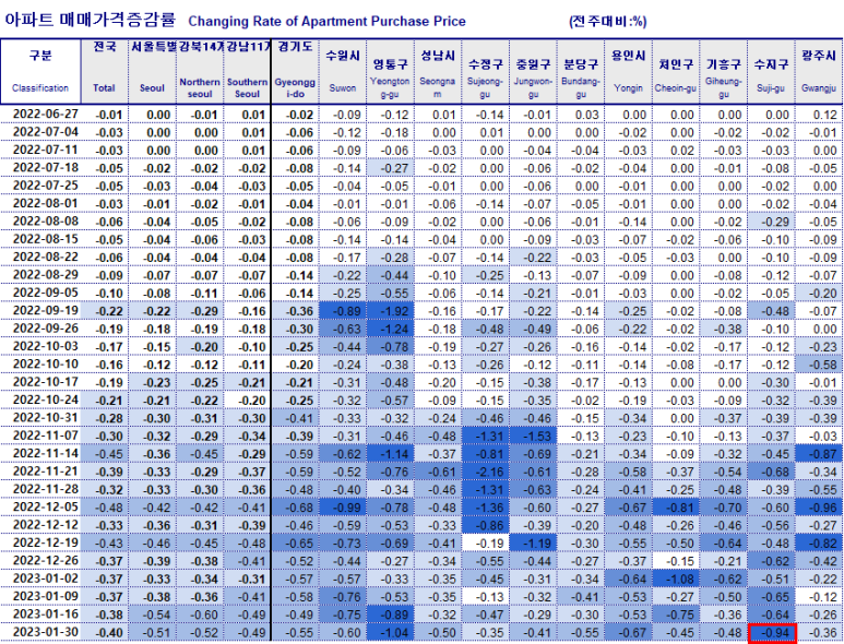 KB부동산이 발표한 용인시 수지구의 주간 매매가격 증감률은 지난주 대비 -0.94% 하락하였습니다.