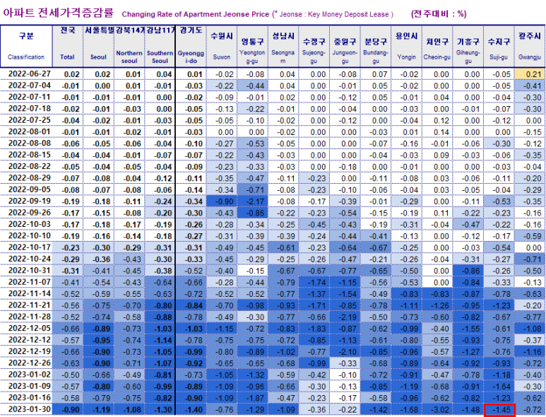 KB부동산이 발표한 용인시 수지구의 주간 전세가격 증감률은 지난주 대비 -1.45% 하락하였습니다.